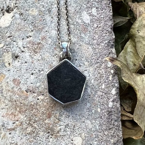 Turmalin czarny naszyjnik półmat to propozycja naszyjnika z czarnego turmalinu oprawionego w oksydowane srebro próby 925. Nieregularna kanciasta bryłka, niezbyt symetryczna, półsurowa, wykończona na lekki mat o wymiarach około 15 x 14 mm trafiła do tego projektu. Do kształtu kamienia stworzyłam odpowiednią na wymiar oprawę.  Spód kamienia również zakryłam srebrem. Kamień w oprawie nie jest zbyt wypukły ma 5mm wysokości. Oprawę kamienia zwieńczyłam ręcznie utworzona przeze mnie krawatką, która psuje również na rzemień. Ja oferuję tą zawieszkę w komplecie z łańcuszkiem gratis. Na koniec zawieszkę z turmalinu powiesiłam na łańcuszku 45 cm długości w tym samym kolorze srebra, który dodałam w komplecie gratis.