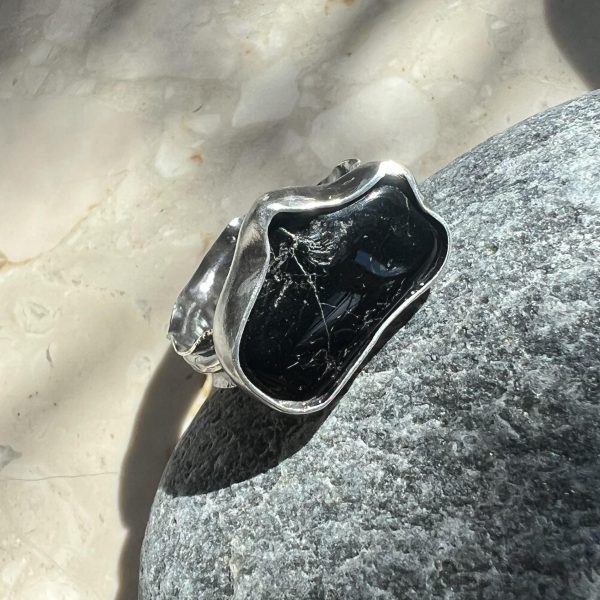 Turmalin w srebrze pierścionek to biżuteria z czarnym turmalinem przeciw negatywizmowi. Kamień o wymiarach około 18 x 11 mm o kształcie nieregularnym oprawiłam w srebro próby 925. Kamień w oprawie umieściłam wzdłuż obrączki, kamień jest więc w poprzek palca. Turmalinek to okaz półsurowy, wypolerowany lekko, ale nie zdarty na maxa by usunąć rysy i zagłębienia. Srebro wykończyłam na ciemno, na koniec mocno je wypolerowałam i przetarłam. Kamień ubrałam w srebro idealnie dopasowałam oprawę do krawędzi kamyka. Obrączkę stworzyłam w typową dla siebie falę oraz przecięłam ją, aby pierścionek miał regulację rozmiaru. Obrączka ma 5 mm szerokości i można ją dopasować nawet na duży rozmiar. Jest wygodna w noszeniu a palec nie będzie się odparzał.